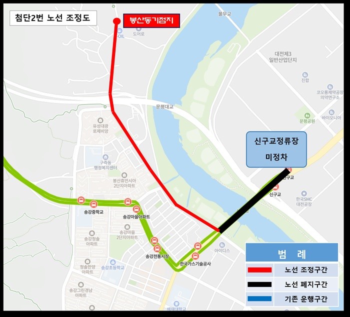 - 첨단 2번 1월 1일부터 신구교 미경유, 봉산동기점지로 운행 - [대전 세계타임즈=이채봉 기자] 대전시는 2월 12일부터 시내버스 신규 노선과 일부 대단위 주거 단지 연계 노선 강화를 위한 조정 운행에 들어간다.