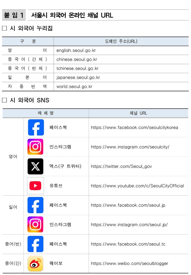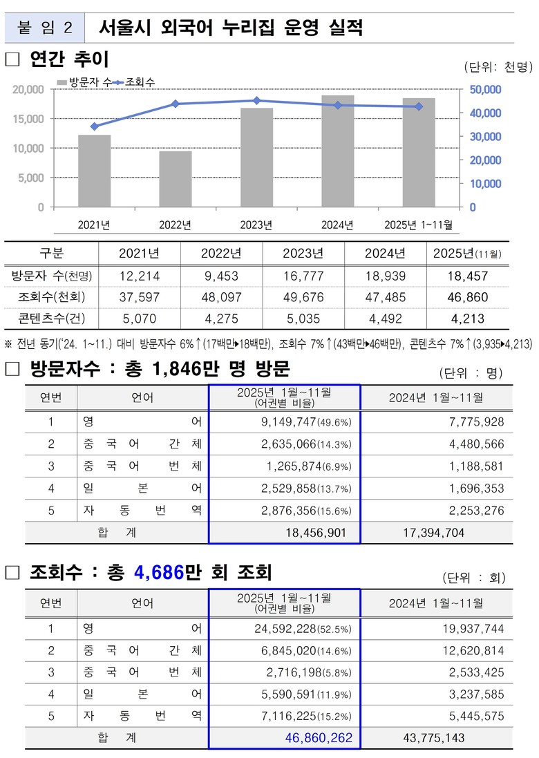 서울시는 시 우수정책을 해외에 효과적으로 홍보하기 위한 영어, 일본어, 중국어 등 8개의 온라인 채널(유튜브, 인스타그램, 페이스북, 엑스, 웨이보)의 구독자가 올해 400만 명을 돌파했으며 또한, 영어, 일본어, 중국어 등 5개 웹사이트에 2025년 방문자수가 1,846만 명(일평균 방문자 수는 5만 5천명)으로 늘었다고 밝히며 높아진 한류 콘텐츠와 서울에 대한 관심을 반영한 것으로 보고 있다.