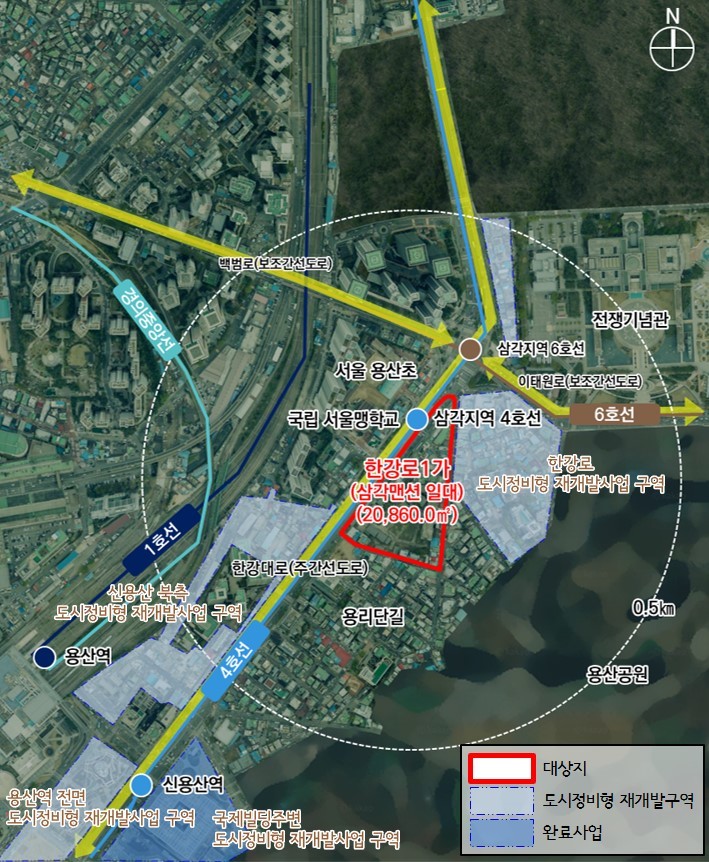 한강로1가 도시정비형 재개발구역은 지하철 4, 6호선 삼각지역 역세권 내에 위치하여 2025 도시환경정비기본계획(2016)에 따라 정비예정구역으로 지정되어 도심 기능연계, 노후 주거환경 정비 등을 목표로 용산구에서 정비구역 지정 및 정비계획(안) 마련을 추진하였다.