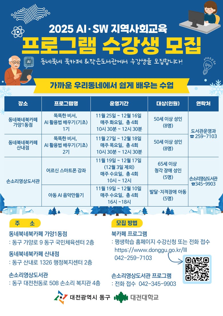 프로그램은 시작 전까지 홍보문 내 정보무늬(QR코드) 또는 동구 평생학습 누리집을 통해 신청할 수 있으며, 작은도서관 프로그램은 손소리영상도서관(☎042-345-9903)으로 전화 신청이 가능하다. 교육은 전 과정 무료로 운영된다.