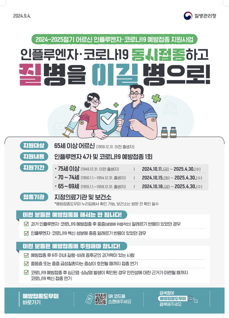 특히, 65세 이상의 어르신, 면역저하자, 감염취약시설 입소자는 코로나19 신규 도입 백신(JN. 1 단가 백신)의 접종 권고 대상으로, 이달 11일부터 독감 백신과 동시에 무료로 접종할 수 있다.