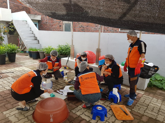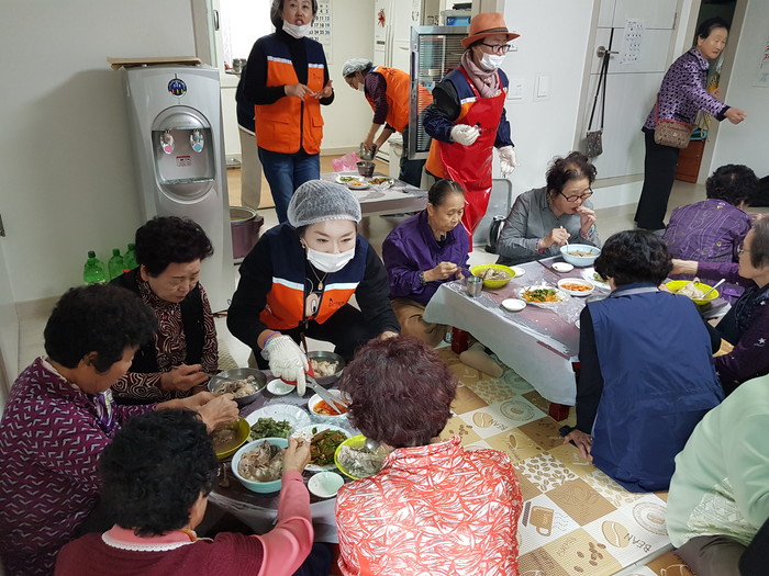 이날 봉사에는 유희자 단장을 비롯해서 회원 10명이 삼계탕, 닭죽, 묵무침, 부침개를 만들어서 50명의 어르신들에게 점심식사를 대접하였다.