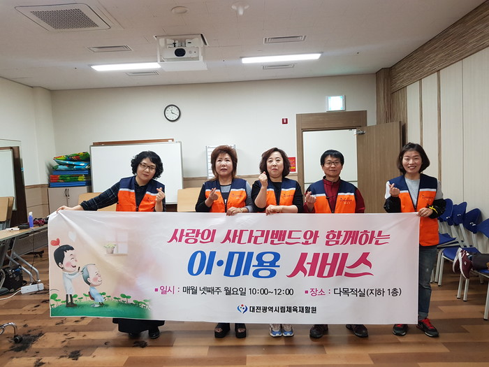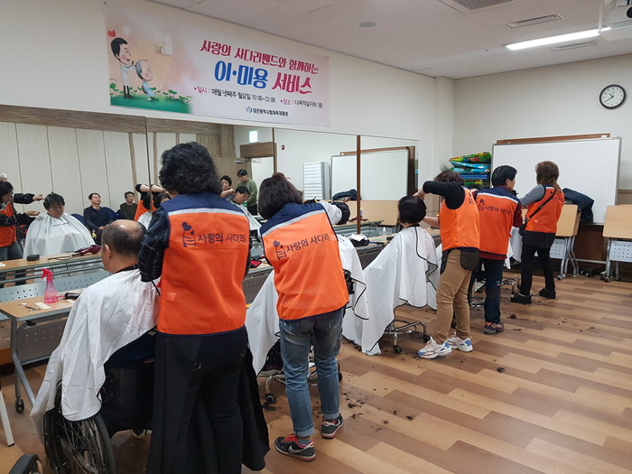 [대전=세계타임즈 이장성 기자] 대전시 SNS 봉사단체 사랑의 사다리 밴드(리더 이정제)는 25일 오전10시, 대덕구 대화동에 위치한 대전시체육재활원(원장 박순용)에서 미용 봉사로 우리 사회의 따뜻한 사랑을 전달하였다.