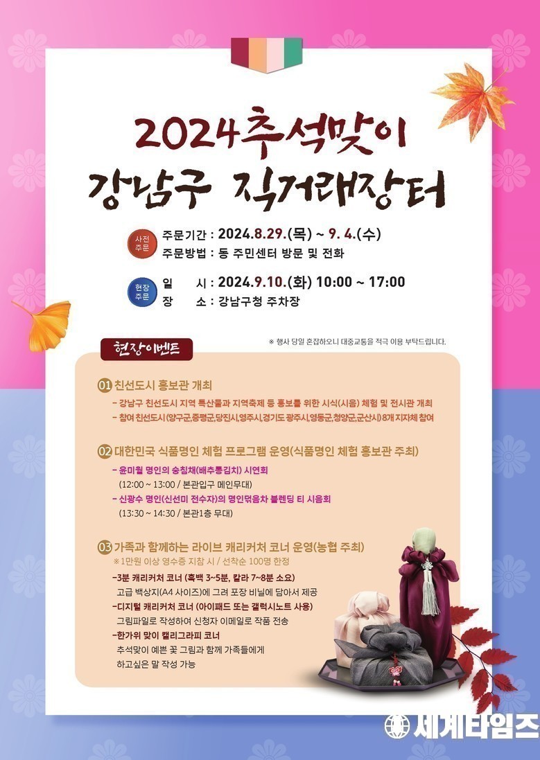 조성명 강남구청장은 “이번 직거래 장터에서 구민들이 양질의 지역 특산물을 알뜰하게 구매할 수 있을 뿐 아니라 강남구와 교류하는 친선도시를 더 가까이서 만날 수 있도록 했다”며 “명절 분위기 물씬 나는 흥겨운 장터를 방문해 풍성한 한가위를 준비하길 바란다”고 밝혔다.세계타임즈 / 신상철 기자 news@thesegye.com