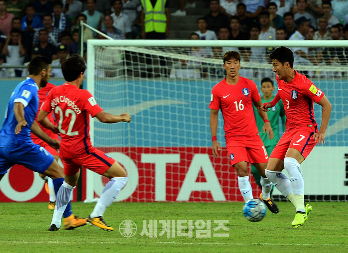 5일(현지시간) 오후 우즈베키스탄 타슈켄트 분요드코르 경기장에서 열린 '2018 러시아 월드컵 아시아 최종예선' 대한민국 대 우즈베키스탄의 경기, 손흥민이 볼을 팀 동료들에게 연결하고 있다. 2017.09.06.