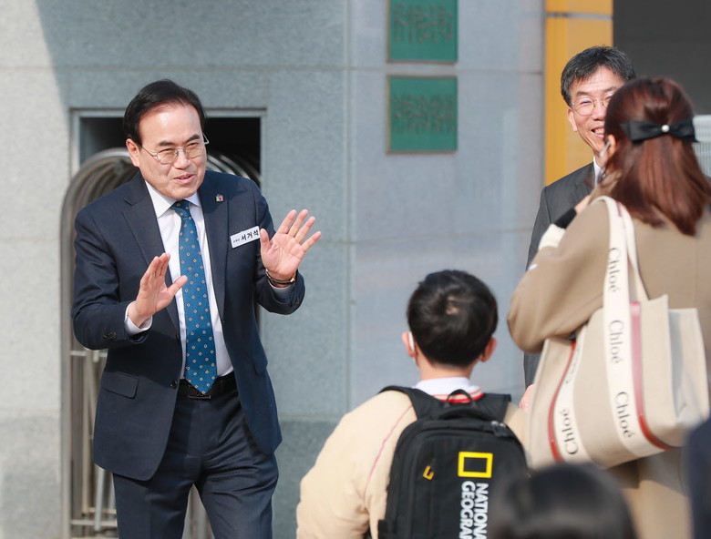 서거석 교육감은 이날 입학식 행사에 참석하기 위해 학교에 첫발을 내딛는 신입생들을 교문 앞에서 맞이하며 힘찬 학교생활을 응원했다.