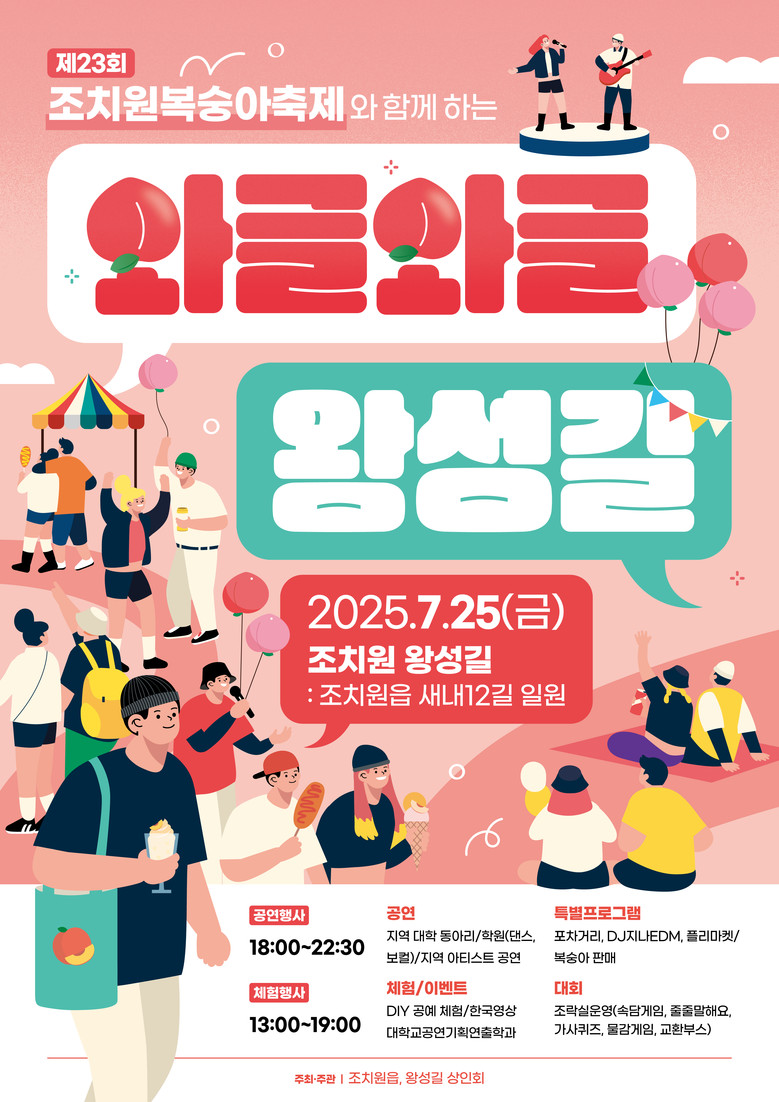 김병호 조치원읍장은 “이번 축제를 계기로 왕성길이 복숭아축제와 연계된 상권활성화 거점 거리로 자리 잡기를 기대한다”며 “시민과 방문객 모두가 즐길 수 있는 축제가 될 수 있도록 최선을 다하겠다”고 말했다.