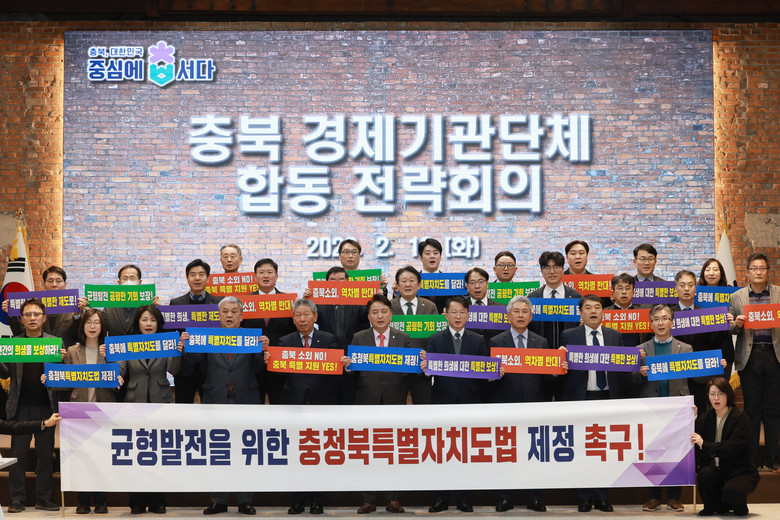 회의에 앞서 참석자들은 최근 정부에서 발표한 대전·충남 등 통합 논의가 국가균형발전이라는 큰 틀에서 추진되는 만큼, 충북 역시 이에 상응하는 정책적 배려와 제도적 지원이 병행돼야 한다며 ‘충청북특별자치도법안’ 제정 촉구 퍼포먼스를 진행했다.