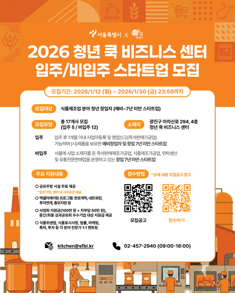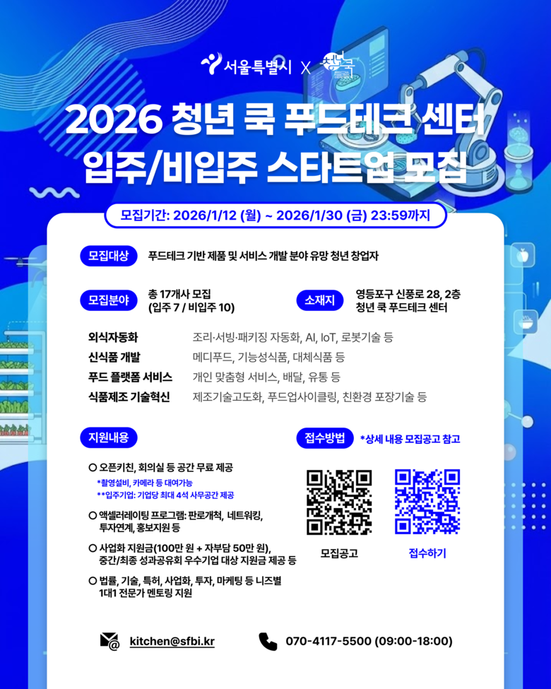모집 기간은 1월 12일(월)~1월 30일(금)이며, 19~39세 청년이 창업한 식품제조업, 푸드테크 기업이라면 신청할 수 있다. 의무 복무 제대 군인의 경우 복무 기간에 따라 지원 연령이 최대 42세까지 연장 적용된다. 신청‧접수는 청년 몽땅 정보통(https://youth.seoul.go.kr)에서 온라인으로 진행된다.