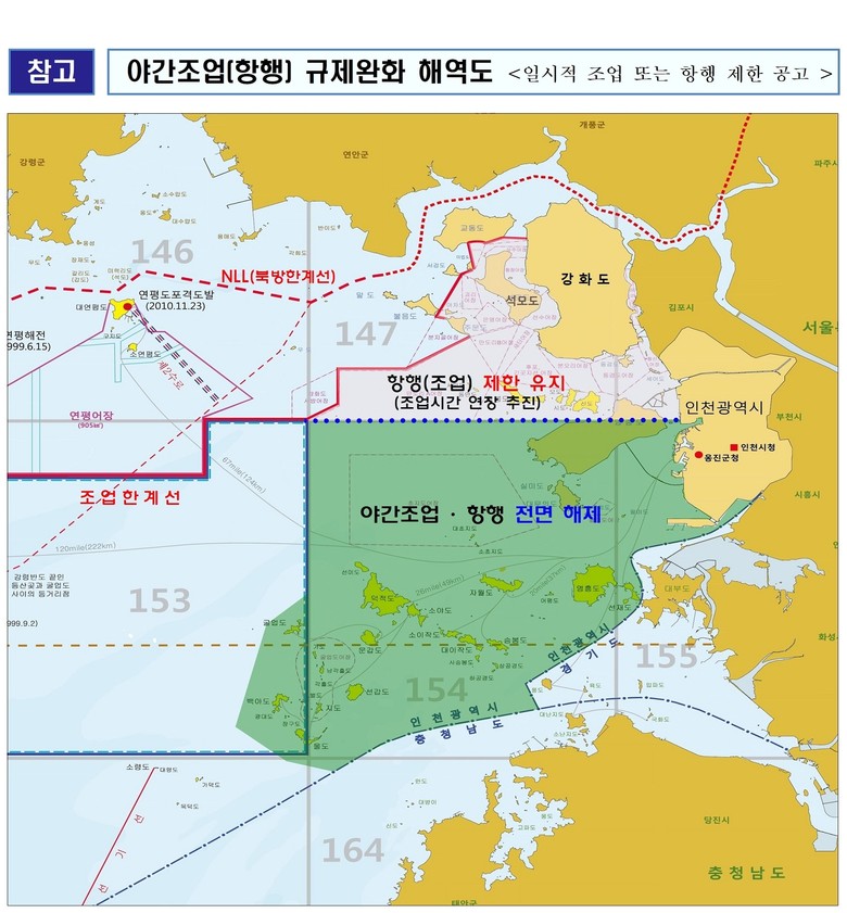 다만, 강화도 주변 어장에 대해서는 현행 조업시간을 4시간 연장하는 방안을 건의했으나, 안보상 이유로 일출·일몰 전후 각 30분씩 총 1시간 연장하는 것으로 협의됐다. 이에 대해 강화군 어업인들은 수용이 어렵다는 입장을 밝히고 있다.