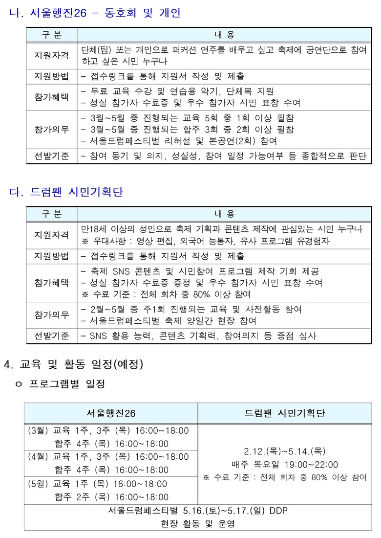 이번 ‘드럼팬’ 모집에서 가장 눈길을 끄는 프로그램인 ‘서울행진26’은 직접 타악기 연주에 참여할 시민공연단으로, 아티스트 그룹과 일반 시민(동호회 및 개인)으로 나누어 모집한다.