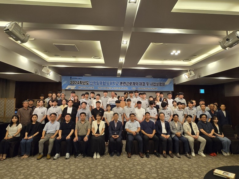14개의 협약기업 관계자와 2학년 반도체전자과 도제반 25명의 학생과 학부모, 교직원 등 약 100여 명이 참석한 가운데 ▲고숙련 일학습병행(P-TECH)* 안내 ▲도제학교 사업설명회 ▲훈련근로계약체결식 순으로 진행되었다.