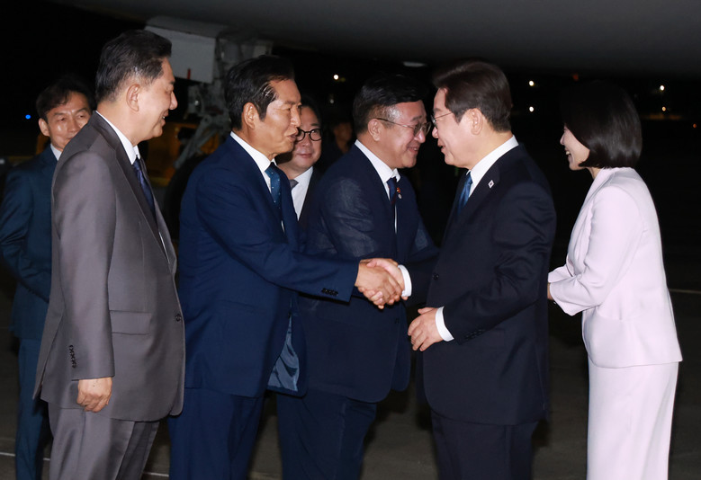 이재명 대통령과 김혜경 여사가 일본·미국 방문 일정을 마치고 28일 경기도 성남 서울공항에 도착해 영접 나온 더불어민주당 정청래 대표와 인사하고 있다. 2025.8.28