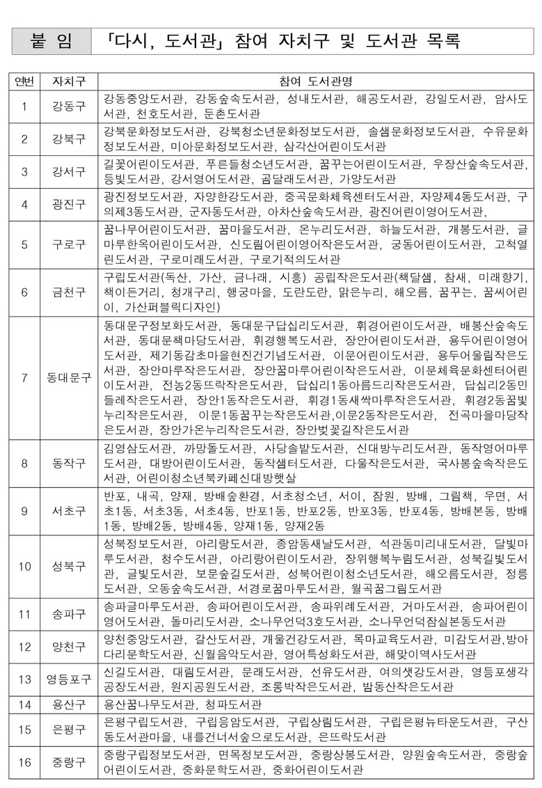 - 서울도서관 및 16개 자치구의 174개 공공도서관 함께 참여하는 공동 캠페인