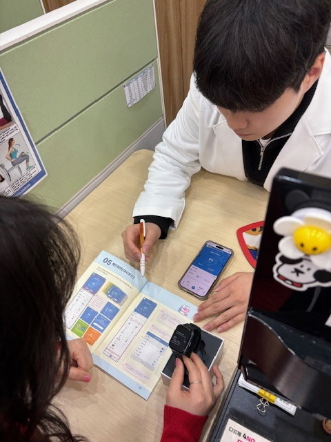 | ▲ 모바일 헬스케어사업 참여자가 모바일 앱(채움건강)과 활동량계(스마트밴드)에 대한 설명을 듣고 있다. |