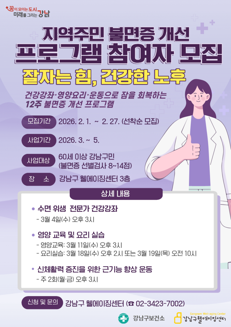 조성명 강남구청장은 “약물에만 의존하지 않고도 생활 속에서 수면 습관을 바로잡아 활력을 되찾도록 돕는 프로그램을 통해 어르신들이 보다 건강한 일상을 이어가길 바란다”며 “앞으로도 웰에이징센터를 중심으로 예방 중심 건강관리 지원을 꾸준히 강화하겠다”고 말했다.