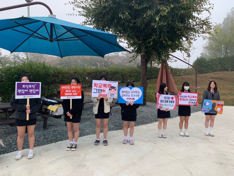 학생자치회 김미혜 회장 학생과 교직원들은 등교하는 학생들이 제일 많은 시간인 7시 30분부터 8시 30분까지 정문 및 현관에서 학교폭력 예방 피켓을 들고 학생자치회 주관으로 캠페인을 펼쳤다.