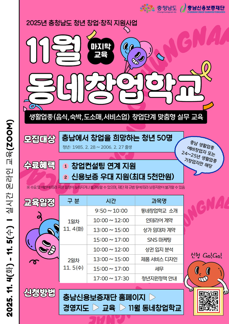 이 교육은 충남신용보증재단 누리집 교육 게시판(cnsinbo.co.kr/education.html)에서 신청할 수 있으며, 자세한 사항은 해당 공고문 및 충남신용보증재단 창업성장지원부(041-530-3803)로 문의하면 된다.
