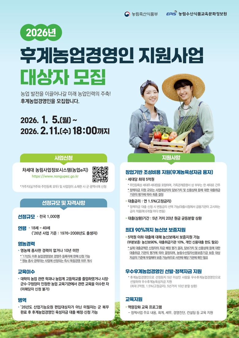 선발된 후계농업경영인은 농지(토지) 구매·시설 설치 및 임차를 위한 후계농업경영인 육성자금과 영농 기술·경영 교육 등 다양한 지원을 제공받는다.