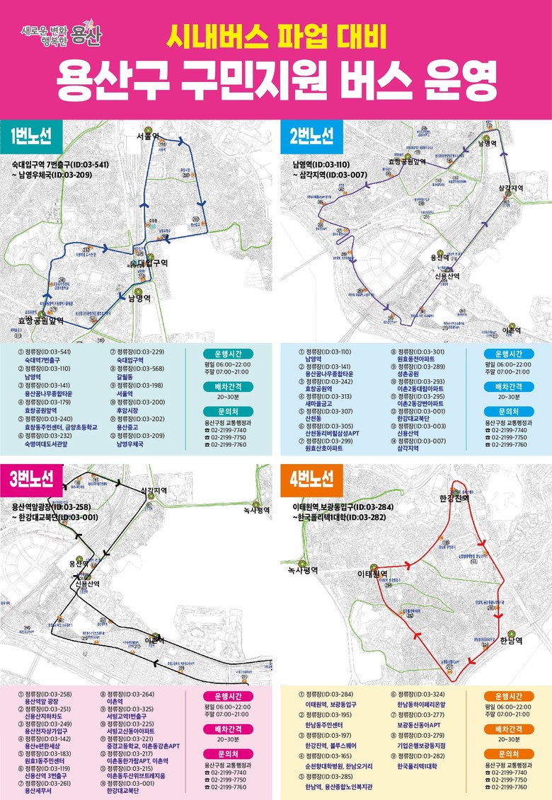 용산구는 시내버스 운행 중단으로 인한 교통 공백을 줄이기 위해 주요 지하철역과 연계한 구민 지원 버스를 운행 중이다. 지원 버스는 용산구 전역을 4개 권역으로 나누어 운영되며, 오전 6시부터 오후 10시까지 권역별로 45인승 전세버스 4대씩, 총 16대가 투입된다.