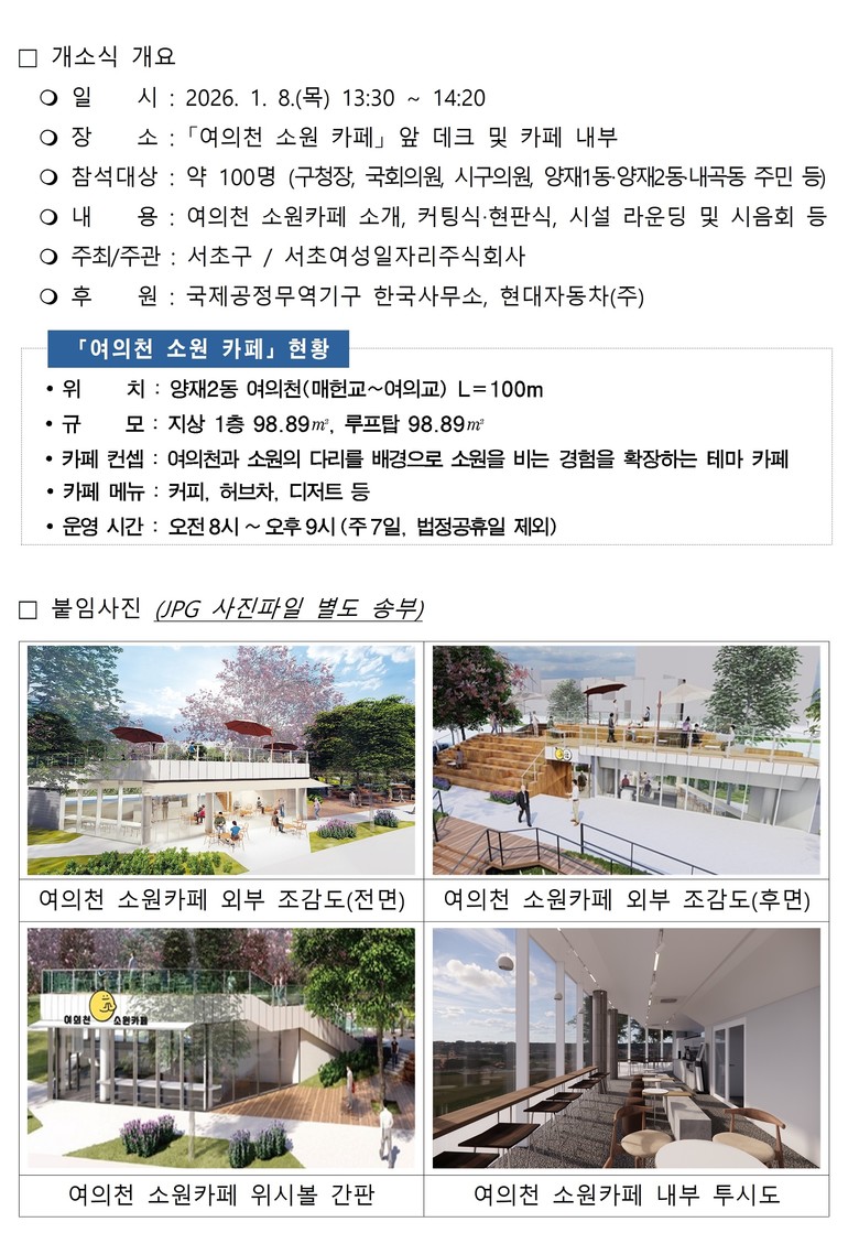 전성수 서초구청장은 “여의천 소원카페는 주민들에게는 일상의 쉼과 여유를, 지역에는 새로운 활력을 더하는 공간”이라며, “앞으로도 여의천을 자연·문화·일상이 어우러진 서초형 수변명소로 지속적으로 가꿔 나가겠다”고 말했다.
