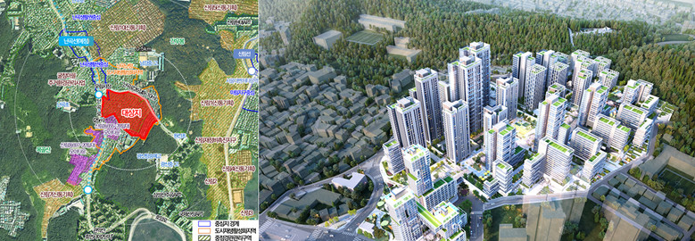 | ▲ 신림8구역 재개발 정비구역 위치도와 조감도 |
