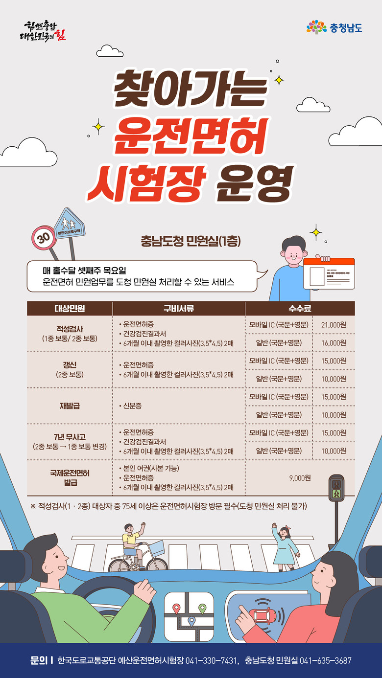 찾아가는 운전면허시험장은 한국도로교통공단 예산운전면허시험장과 협력해 운전면허 관련 민원 업무를 도청 민원실에서 직접 처리하는 서비스로, 내포신도시 인근 거주 도민들에게 큰 호응을 얻고 있다.