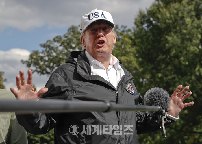 도널드 트럼프 미 대통령이 14일(현지시간) 플로리다주 수해 현장을 시찰한 뒤 백악관으로 돌아와 취재에 응하고 있다. 2017.9.15