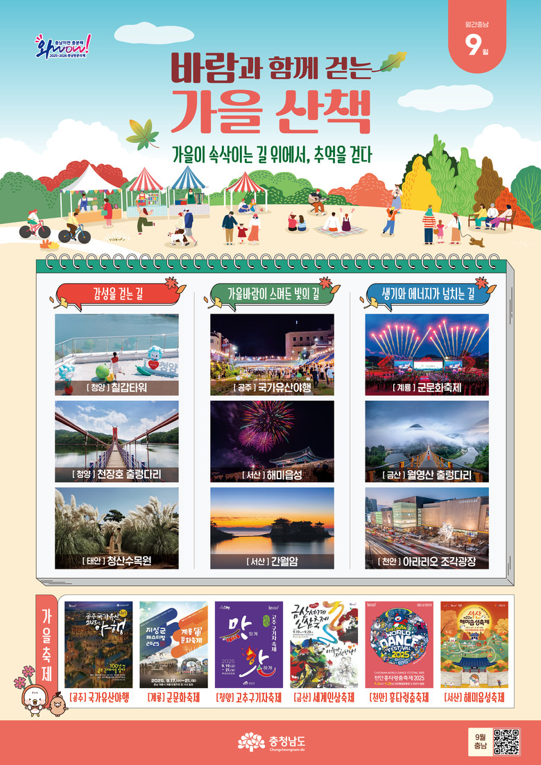 9월 주제는 ‘바람이 함께 걷는 가을 산책’으로 선선한 바람과 따스한 햇살, 깊어지는 가을빛 속에서 충남의 명소를 따라 초가을의 감성과 계절의 시작을 만끽할 수 있는 여정을 안내한다.