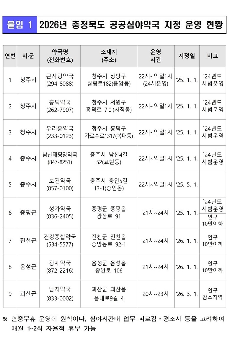 기존 지정·운영해 온 약국은 청주 3개소, 충주 2개소, 증평 1개소이며, 올해 추가된 약국은 ▲진천 건강종합약국 ▲음성 광재약국 ▲괴산 남지약국*이다. * 괴산 남지약국 : 2026. 3. 1.부터 운영
