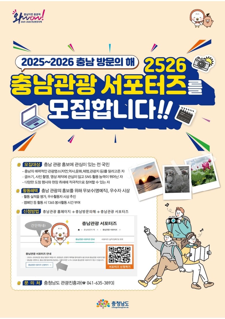 서포터즈 참여 신청은 충남관광 누리집(https://tour.chungnam.go.kr/prog/sprtrs/kor/sub06_05/list.do)에서 신청하거나 모집 포스터의 정보무늬(QR코드)를 통해 할 수 있다.