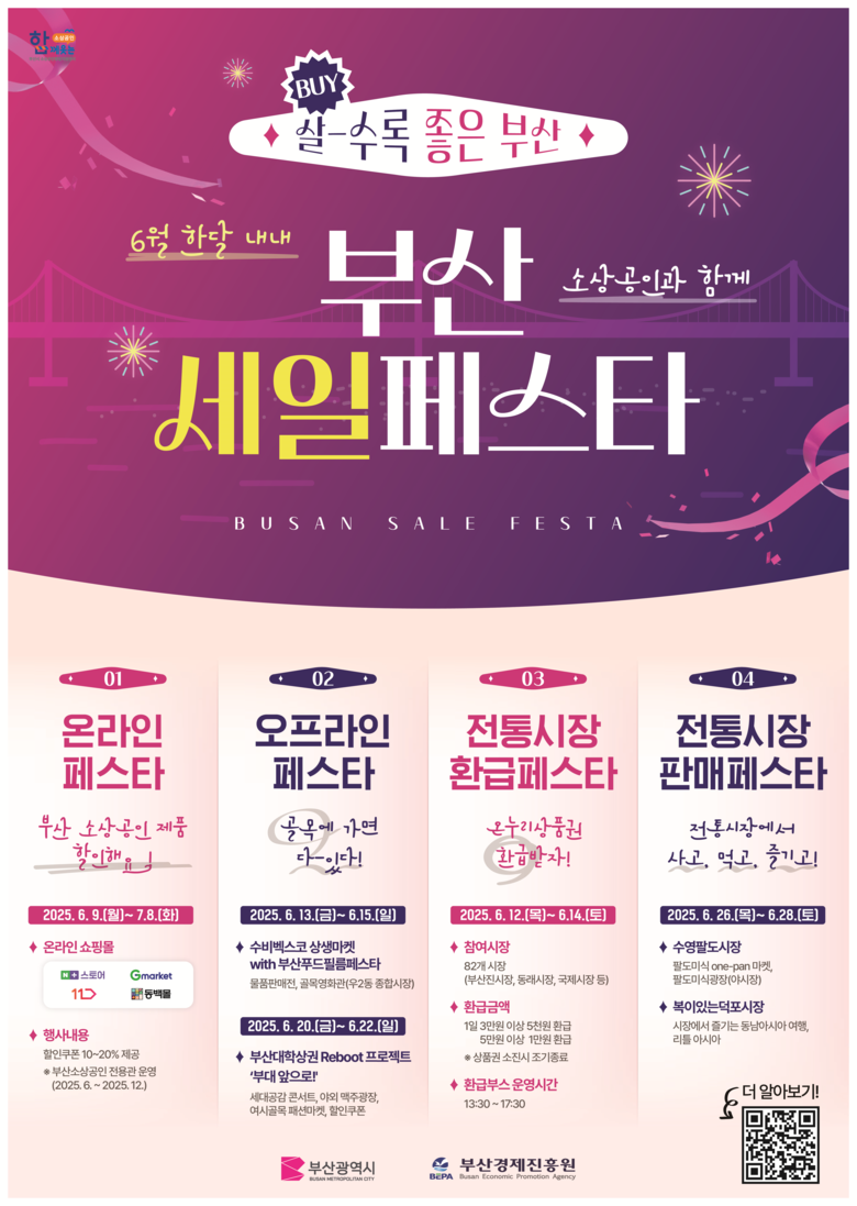 박형준 시장은 “6월 한 달 동안 시민 모두가 즐기면서 지역경제에도 도움이 되는 다양한 행사를 마련했다”라며, “이번 부산세일페스타가 지역 상권과 전통시장에 새로운 활력을 불어넣는 계기가 되길 바라며, 앞으로도 지역 소비를 촉진할 수 있는 다양한 정책을 지속해서 추진하겠다”라고 밝혔다.