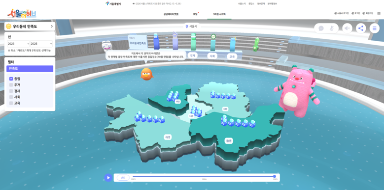 행복지수, 우리 동네 만족도 등에 대한 3차원 시각화 자료는 서울데이터허브 누리집(http://data.seoul.go.kr/bsp)에서 확인할 수 있다.