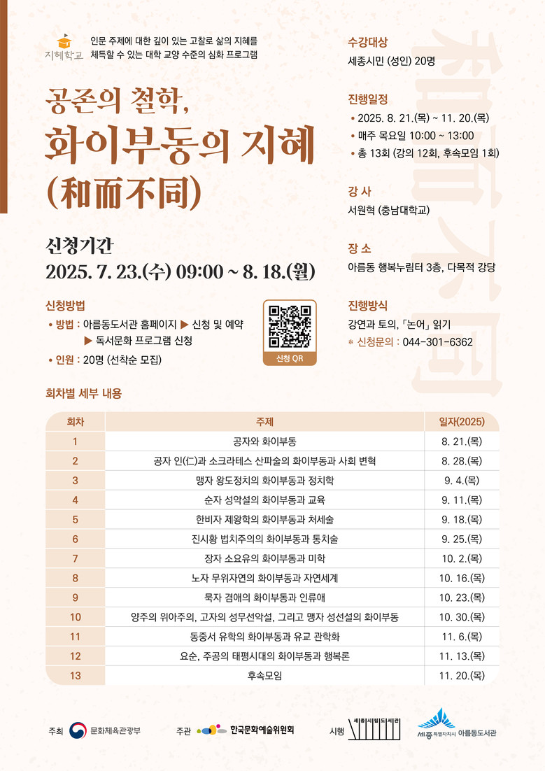 아름동도서관이 운영하는 이번 프로그램은 ‘공존의 철학, 화이부동(和而不同)’을 주제로 진행되며 강의는 서원혁 충남대학교 교수가 맡는다.