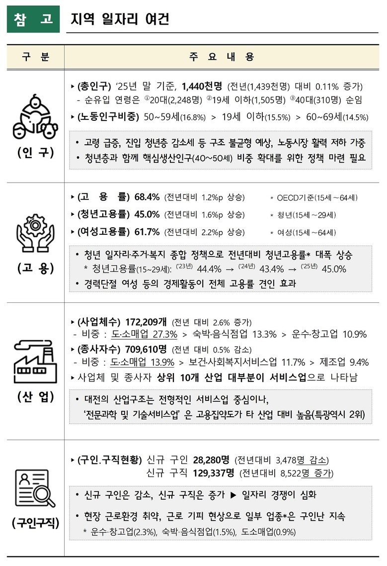 특히 최근 국제정세 불안 등으로 고용 둔화 우려가 커지는 상황을 고려해 공공부문의 마중물 역할을 강화하고, 민간 고용시장의 활력을 적극 유도할 방침이다. 아울러 대전이 보유한 세계적 수준의 과학기술 역량과 인적 인프라를 기반으로 미래 신산업 중심의 일자리 창출과 함께, 단순한 양적 확대를 넘어 일자리 질적 개선을 통한 시민 체감도 향상에 주력할 방침이다.