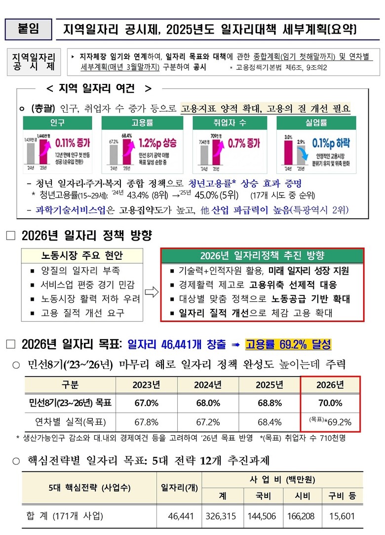 시는 올해 총 3,263억 원의 예산을 투입해 4만 6,441개의 일자리를 창출하고, 고용률(15~64세) 69.2% 달성을 목표로 설정했다. 또한 청년고용률(15~29세) 44.8%, 여성고용률(15~64세) 61.8% 등 세부 목표를 통해 고용시장 활성화에 행정력을 집중할 계획이다.