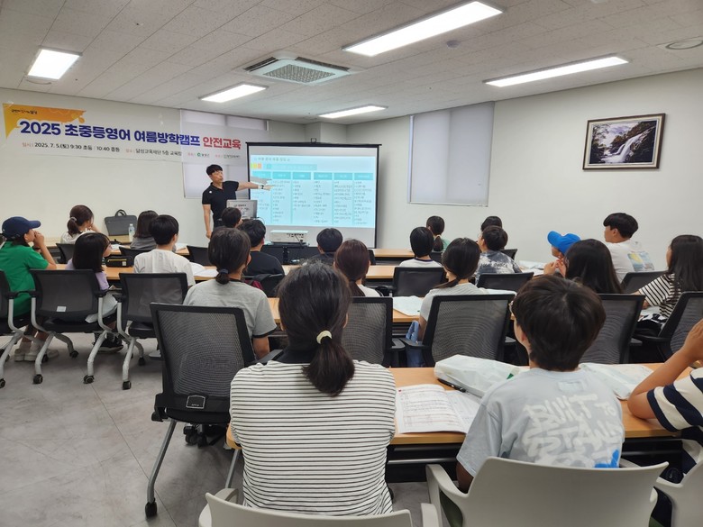 | ▲ 7월 5일 초등영어캠프 참가 학생들을 대상으로 열린 안전교육 현장. 강사가 학생들에게 필수 준비물을 안내하고 있다. |
