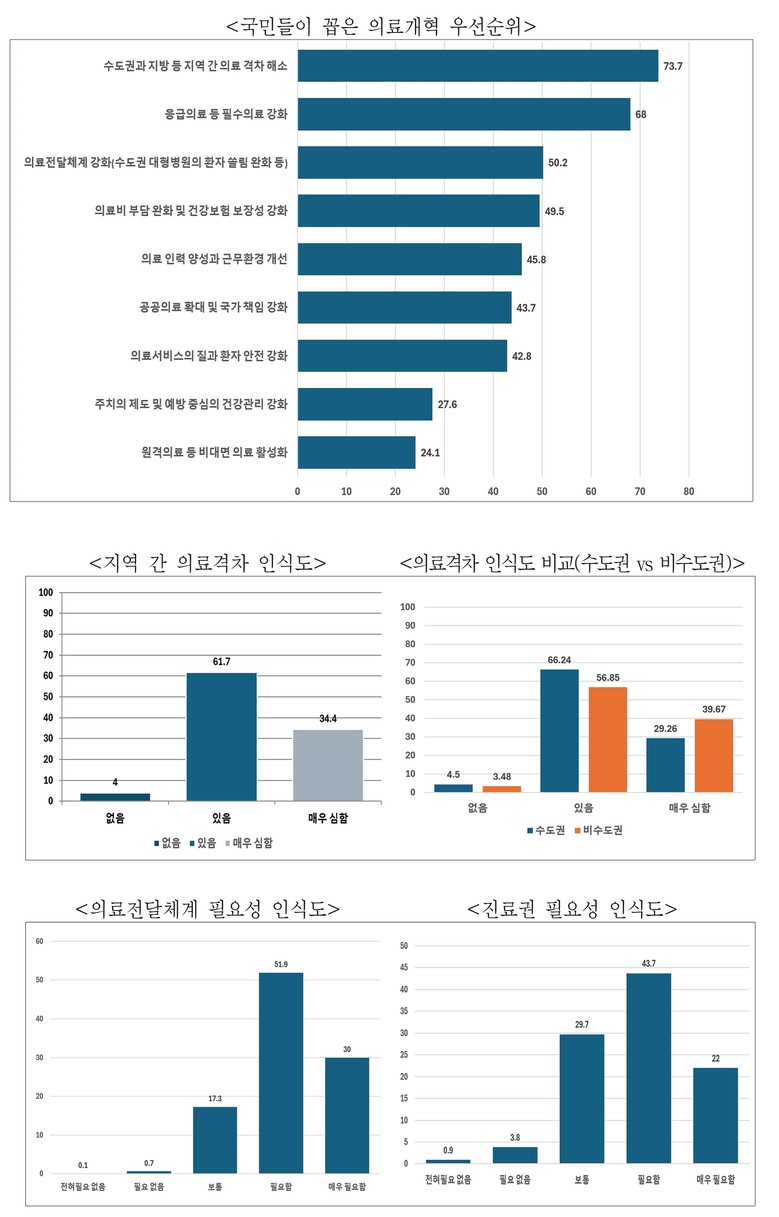 의료 개혁이 가장 필요하다고 생각하는 분야로는 ‘지역 간 의료격차 해소’가 73.7%로 가장 많았고, 다음으로 ‘필수의료 강화’(68.0%), ‘의료전달체계 강화’(50.2%) 순으로 나타났다. 특히 지역의료 격차에 대해 ‘매우 심하다’고 응답한 비율은 34.4%에 달했으며, 거주지역에 따라 체감도 차이가 뚜렷했다. 수도권 거주자는 29.3%, 비수도권 거주자는 39.7%가 ‘매우 심각하다’고 응답해, 비수도권에서 지역의료 격차를 더 심각하게 체감하고 있는 것으로 나타났다.