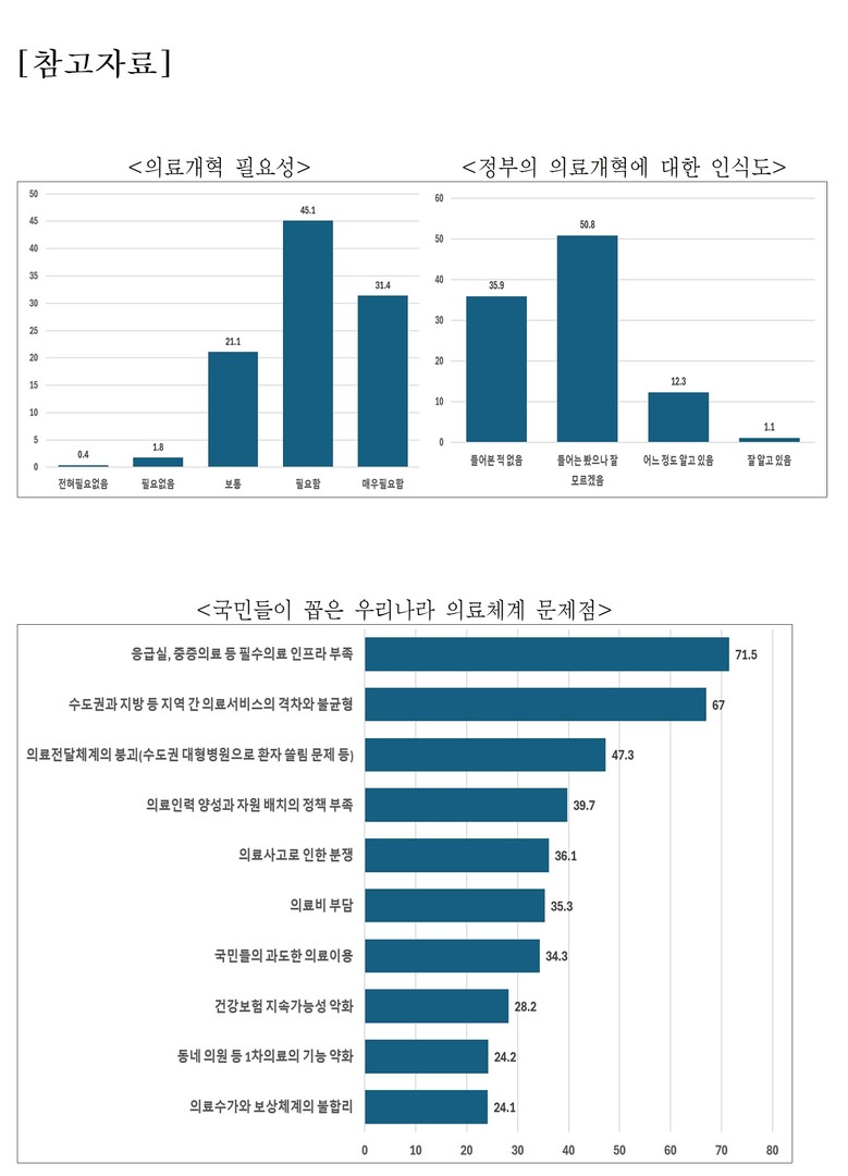 또한, 조사 결과를 바탕으로 성공적인 의료개혁을 위해 ▲국민적 합의를 바탕으로 한 의료전달체계 개선 ▲국민과의 소통 강화와 공감대 형성을 통한 ‘국민 공감 의료개혁 추진’을 제안했다.