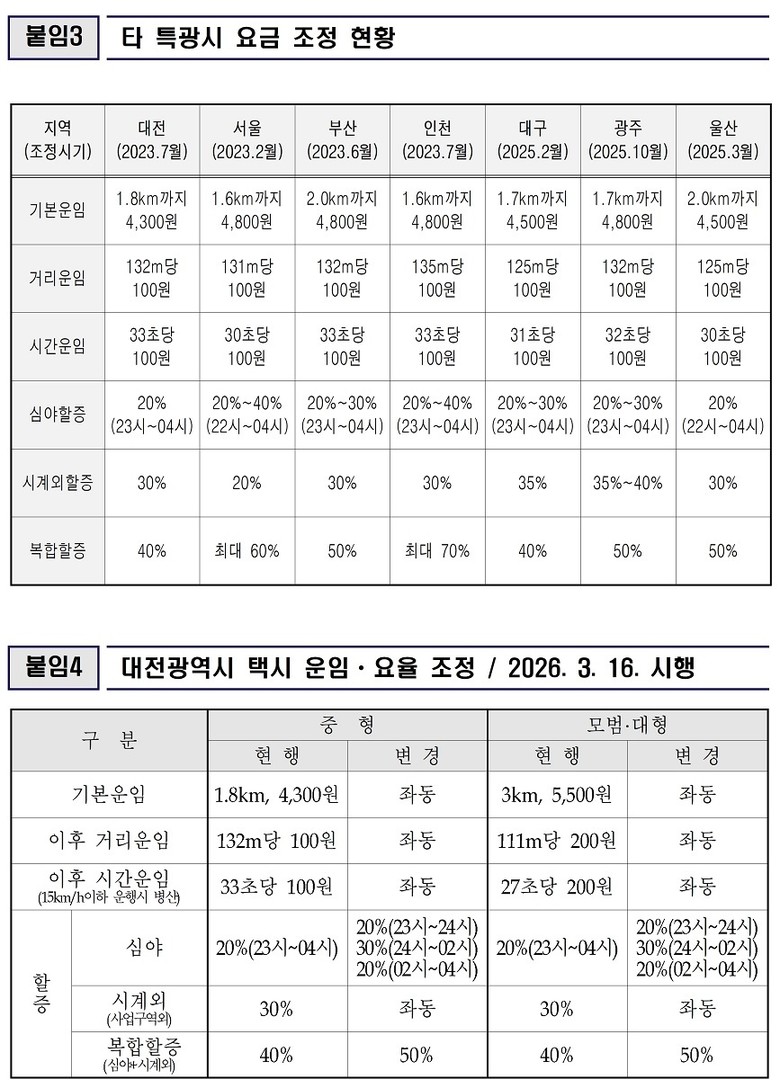 또한, 심야 시간대(23:00~04:00)에 대전시 사업 구역을 벗어나는 경우(시계 외) 적용되는 복합 할증은 기존 40%에서 50%로 상향 조정된다. 시계 외 할증요금은 현행 30%를 유지한다.