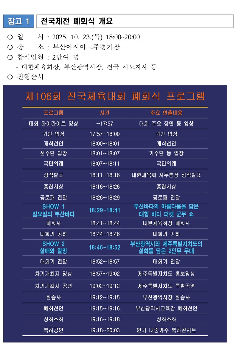 ◈ ▲[쇼(Show) 1 일요일의 부산바다] 휴가, 해변과 관련된 음악과 소품으로 신나는 군무와 대형 바다 퍼펫 쇼(인형극) 연출 ▲[쇼(Show) 2 할매와 할망] 부산 영도할매와 제주 선문대할망의 2인무 [부산 세계타임즈=이용우 기자] 부산시(시장 박형준)는 25년 만에 부산에서 열린 「제106회 전국체육대회」가 7일간의 대장정을 마무리하고, 선수단과 시민들이 함께 축하하며 다음 대회를 기약하는 화합의 장인 '폐회식'을 오는 10월 23일 저녁 6시에 부산아시아드주경기장에서 개최한다고 밝혔다.