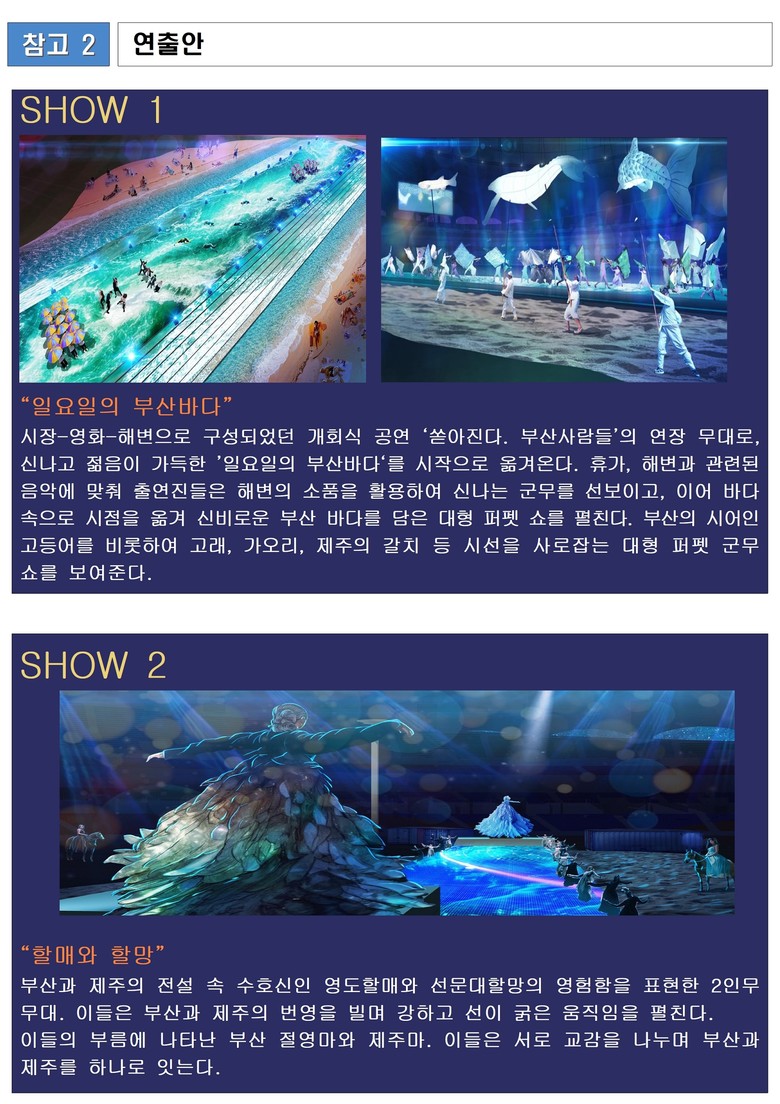 특히, '쇼(Show) 1'과 '쇼(Show) 2'는 경기장 전체를 대형 엘이디(LED) 무대로 꾸며 영상과 공연이 함께 어우러지는 신비로운 무대를 펼칠 예정이다.