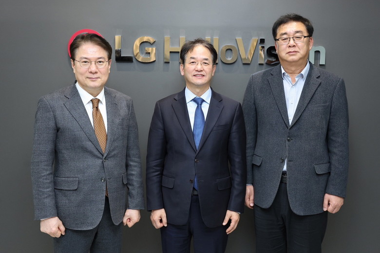 | ▲ 삼송MBN스튜디오 지식산업센터에 입주한 LG헬로비전 방문 기념촬영_왼쪽부터 이동원 MBN매일방송 대표, 이동환 고양특례시장, 송구영 LG헬로비전 대표 |