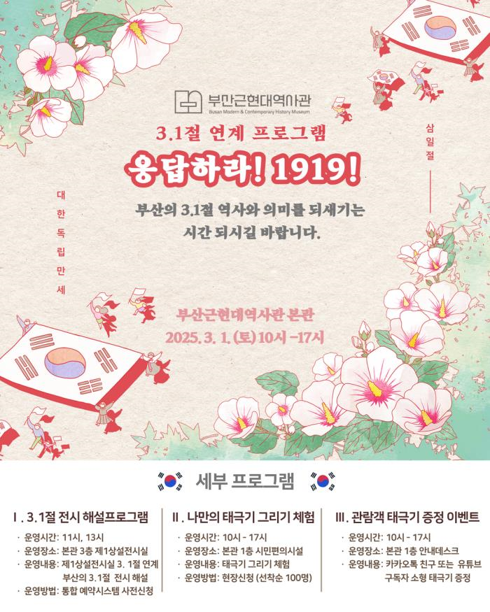 또한, 부산근현대역사관 카카오톡 친구 맺기 또는 유튜브 구독 이벤트 참여자에게는 삼일절 기념 소형 태극기도 증정할 예정이다.