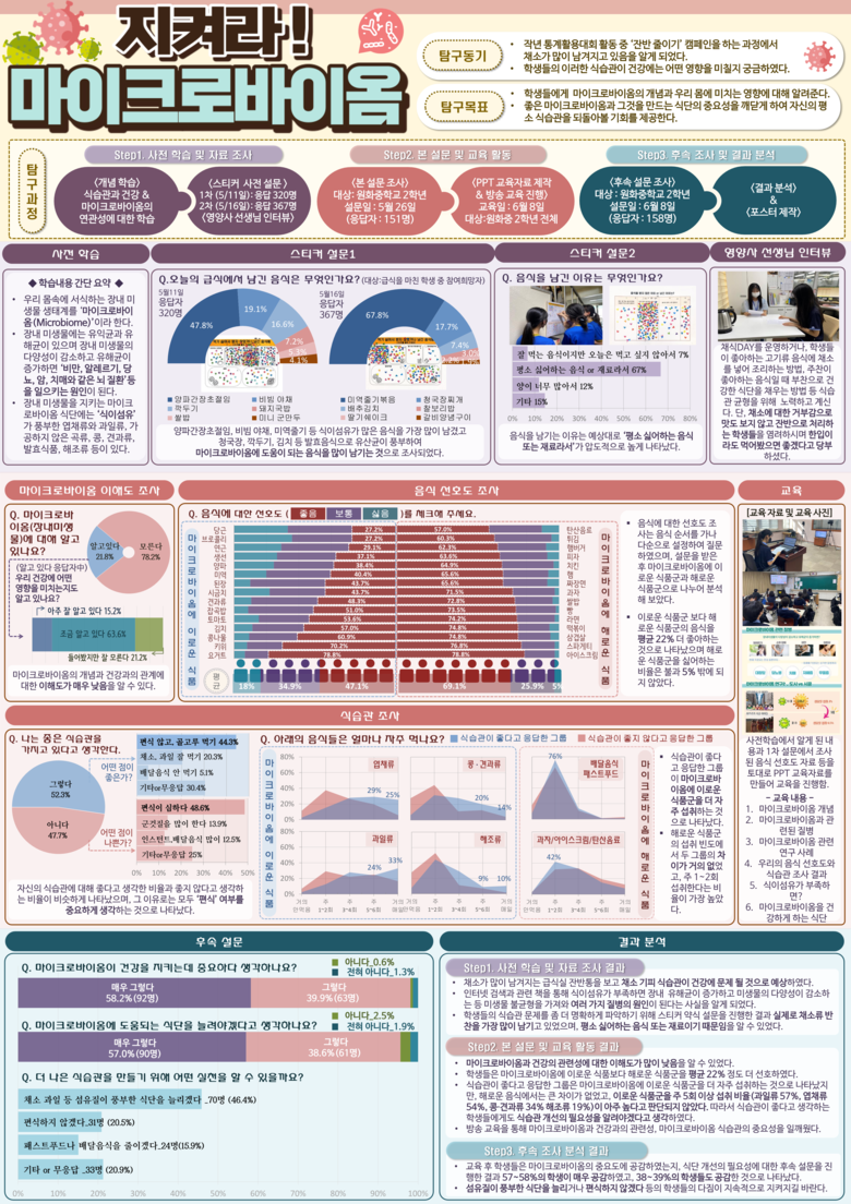 또한, 또래학생들을 대상으로 마이크로바이옴에 대한 인식과 식습관에 대한 수차례의 설문 조사 결과를 분석하고, 마이크로바이옴과 올바른 식습관에 대한 교육을 실시한 뒤, 교육 전·후 학생들의 인식 변화를 통계적 수치로 표현했다.
