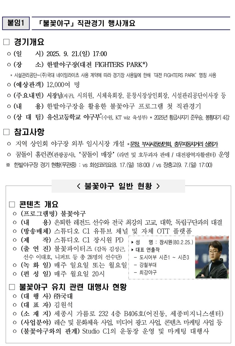 앞서 대전시는 『불꽃야구』 유치 및 전용구장 운영을 위한 3자 협약(MOU)을 체결하고, 지난 8월 17일과 9월 7일, 일반(무관중) 경기 운영을 통해 현장 시스템을 점검하는 등 치밀한 준비 과정을 거쳤다.