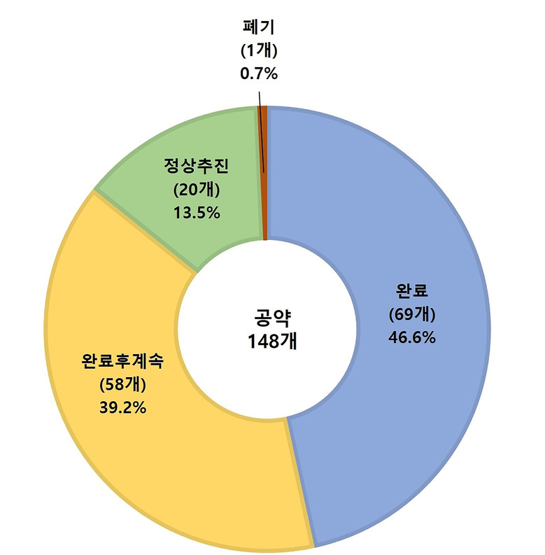 공약 완료율은 85.8%(127개)다. 공약 이행률 96.1%는 완료사업(69개·이행률 100%)과 완료 후 계속 추진(58개·이행률 100%), 정상 추진(20개) 중인 사업별 추진 정도를 백분율로 환산한 평균값이다.