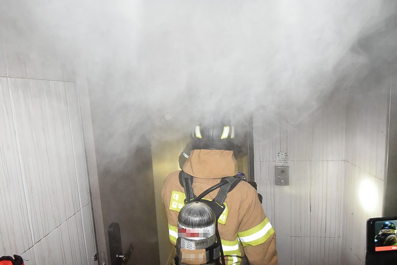 | ▲ 화재 발생한 주택 세대로 진입하는 소방공무원(2020년 10월 추석 연휴기간 서구 괴정동 주택에서 전기적 원인에 의한 화재로 부상 4명 발생) |