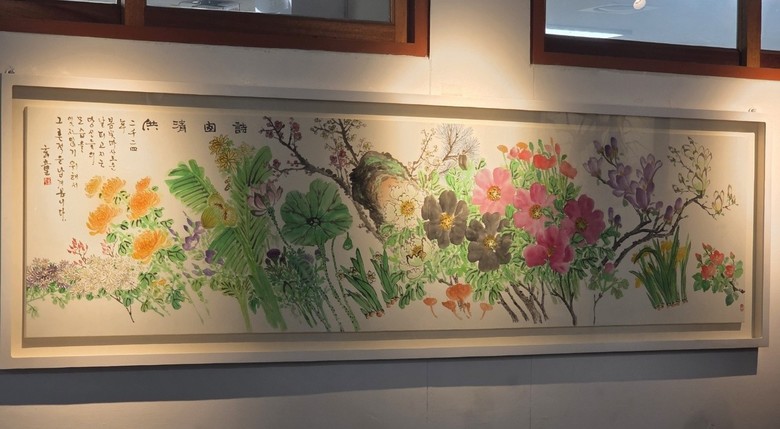 | ▲ 수완고등학교가 25일 교내 본관에서 김광옥·임혜숙 작가 부부에게 한국화 작품을 기증받았다. ‘시창청공(詩囱淸供)’이라는 이름의 기증 작품은 ‘선비의 마음 창문에 비치는 청아한 물건’이라는 의미를 담고 있으며, 창밖의 꽃들이 아름다움을 자랑하듯 수완고 학생들이 맑고 어여쁘게 성장하길 바라는 마음을 담아 작품을 완성했다/ 제공 광주광역시교육청 |