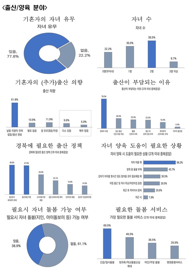 조사 결과, 결혼 의향이 있는 청년이 결혼을 주저하는 가장 큰 이유로 결혼자금이나 안정적 일자리 등 경제적 요인이 가장 크게 작용하는 것으로 나타났다. 출산과 관련해서는 양육비 부담(78%)이 임신‧출산에 따른 건강 위험부담(26.5%)보다 약 3배 높게 나타나 경제적 부담이 출산 결정에 큰 영향을 미치는 것으로 분석됐다.